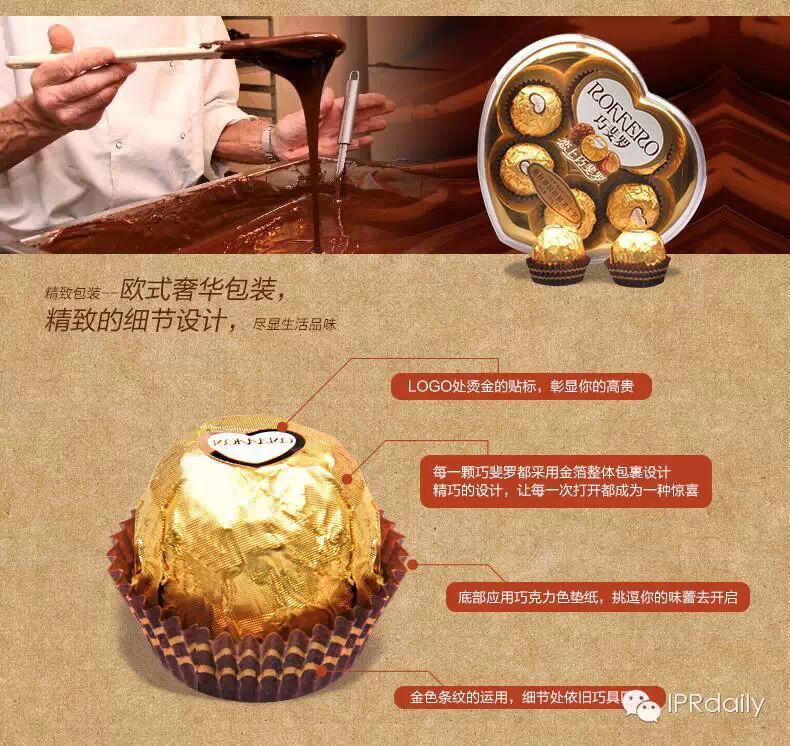 上图是“巧斐罗”产品在网店中的广告宣传图,通过图片我们不难发现,“巧斐罗”巧克力的包装设计完全包含了被侵权商标的几个显著设计要点,这侵权看来是妥妥的没跑了。